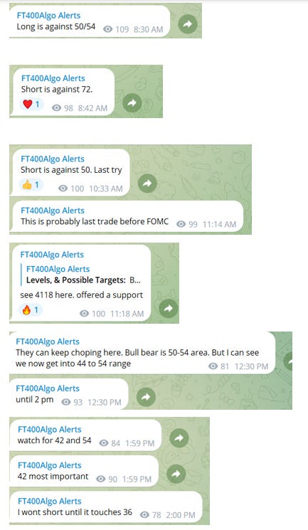 Sub stack subscription does not include real time telegram alerts it only includes this nightly news letter with levels and possible setups. For real time alerts please go to https://futuretrader400.substack.com/about