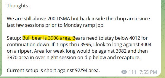 Great day as outlined already in twitter post. Here is what I gave to sub stack subs yesterday nights. We stayed short below 3996 level night session and RTH session. We also longed as planned on RTH open on ripper. We shorted against 4004 that produced multi bagger and stayed with short rips theme entire RTH session.