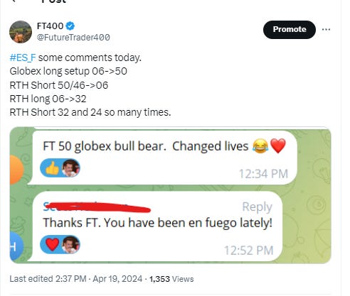 Sub stack subscription does not include real time telegram alerts it only includes this nightly news letter with levels and possible setups. For real time alerts please go to https://futuretrader400.substack.com/about