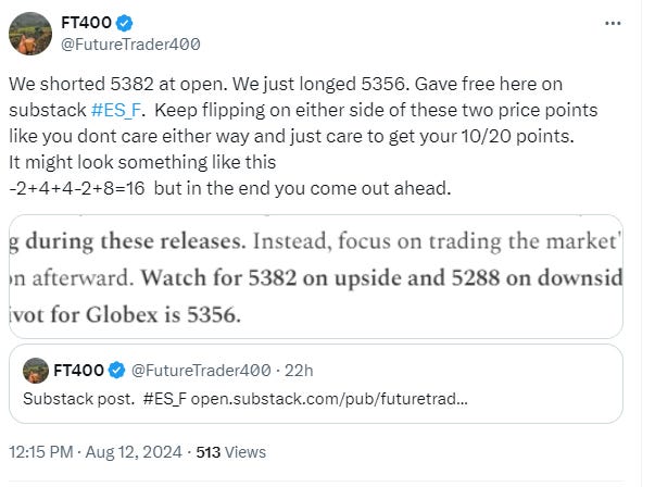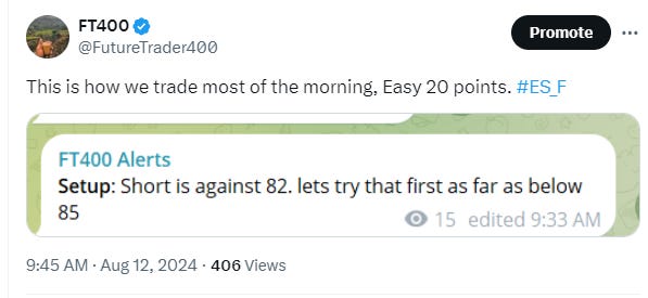 Sub stack subscription does not include real time telegram alerts it only includes this nightly news letter with levels and possible setups. For real time alerts please go to https://futuretrader400.substack.com/about