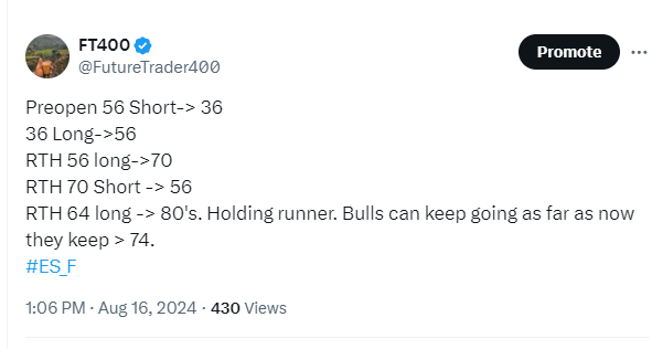 Hope you all had a great weekend. Last week ES recovered almost all of its losses, gaining almost 200 points last week and now almost 450 points above lows a week before. All eyes are going to be on Jackson Hole, Wyoming this week as Powell surveys economy, inflation and lays out road map for interest rates. For day trading though you want to just trade what you see and not second guess the market.