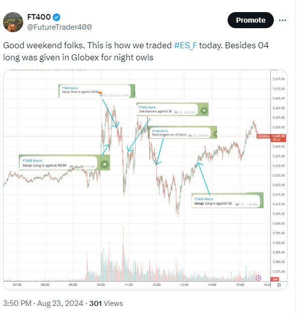 Sub stack subscription does not include real time telegram alerts it only includes this nightly news letter with levels and possible setups. For real time alerts please go to https://futuretrader400.substack.com/about
