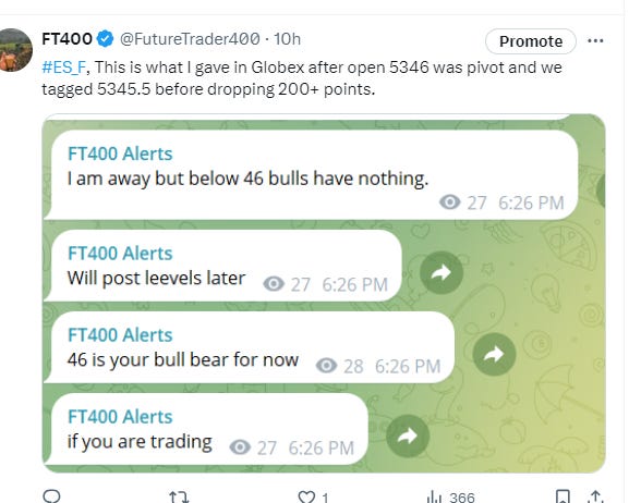 Sub stack subscription does not include real time telegram alerts it only includes this nightly news letter with levels and possible setups. For real time alerts please go to https://futuretrader400.substack.com/about