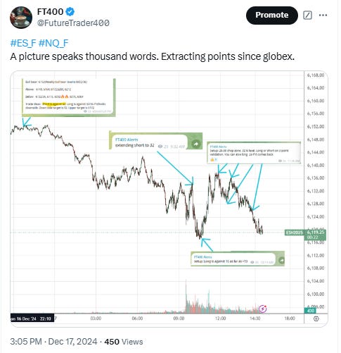 Sub stack subscription does not include real time telegram alerts it only includes this nightly news letter with levels and possible setups. For real time alerts please go to https://futuretrader400.substack.com/about