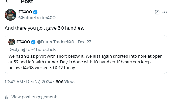 Hope you all had great weekend. Next week markets are closed on 1st. Whole of 2024 was easy money for those who kept on longing with > 25% upside on ES futs and > 30% upside on NQ futs. 2025 probably won’t be that easy with possiblity of two sided market, lets see. We had fabulous trading whole week making hundreds of handles both sides last week as posted on X. Here is our major trade on Friday. We also did some short against 6002 and long against 6012.