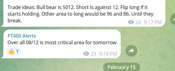 Sub stack subscription does not include real time telegram alerts it only includes this nightly news letter with levels and possible setups. For real time alerts please go to https://futuretrader400.substack.com/about