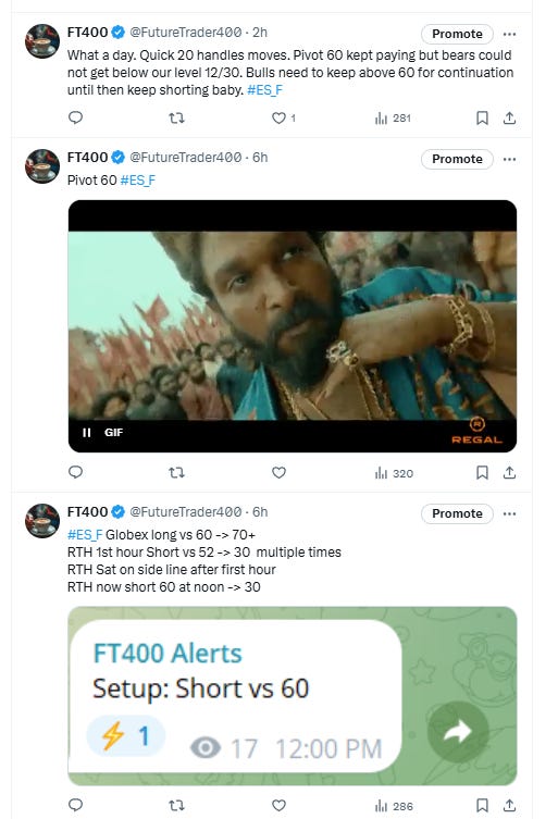 Sub stack subscription does not include real time telegram alerts it only includes this nightly news letter with levels and possible setups. For real time alerts please go to https://futuretrader400.substack.com/about