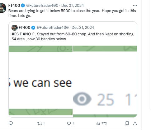 First on prop firm deals. Apex has again 90% off for next couple days and TPT’s current deal ends this week. This is what we did on last trading day of 2024. It was struggle in the morning with 20 handle chop. We then kept shorting 54 and then tried 32 long and then stayed out in last hour with chops.