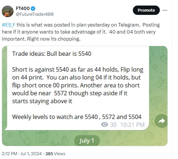 Sub stack subscription does not include real time telegram alerts it only includes this nightly news letter with levels and possible setups. For real time alerts please go to https://futuretrader400.substack.com/about