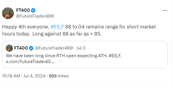 Wish you all in US a very happy Indepedence day. Futures Holiday trading hours can be found here https://www.cmegroup.com/trading-hours.html#tradeDate=2024-07-04