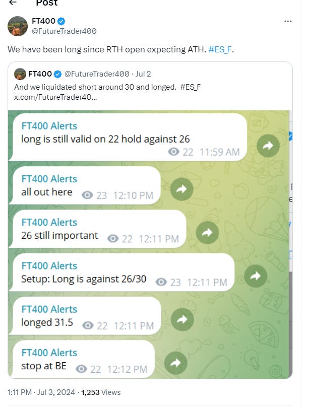 Sub stack subscription does not include real time telegram alerts it only includes this nightly news letter with levels and possible setups. For real time alerts please go to https://futuretrader400.substack.com/about