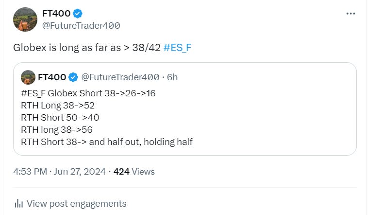 Sub stack subscription does not include real time telegram alerts it only includes this nightly news letter with levels and possible setups. For real time alerts please go to https://futuretrader400.substack.com/about