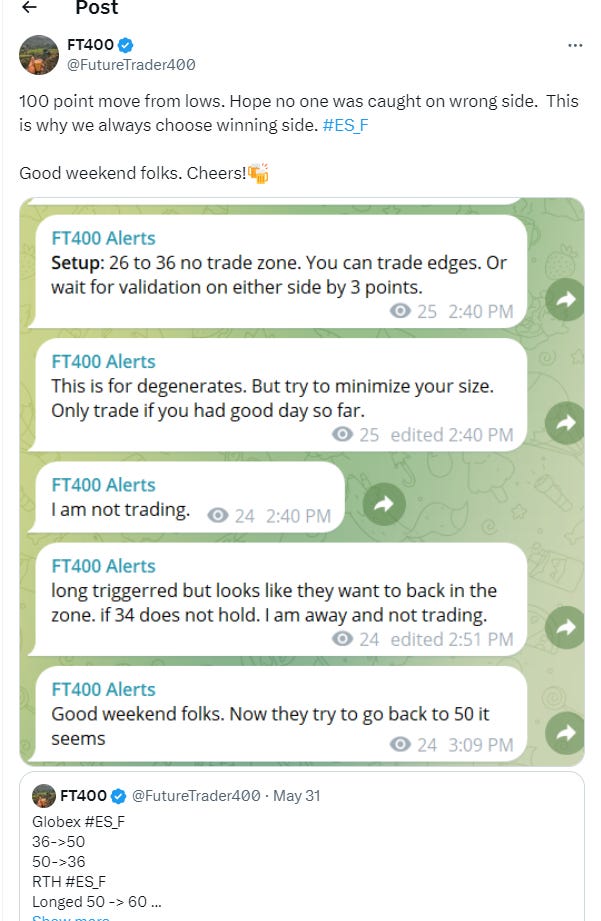 Sub stack subscription does not include real time telegram alerts it only includes this nightly news letter with levels and possible setups. For real time alerts please go to https://futuretrader400.substack.com/about