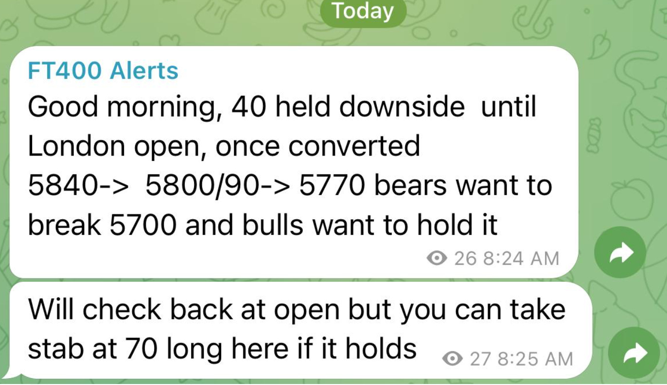 Sub stack subscription does not include real time telegram alerts it only includes this nightly news letter with levels and possible setups. For real time alerts please go to https://futuretrader400.substack.com/about