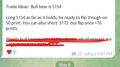 Sub stack subscription does not include real time telegram alerts it only includes this nightly news letter with levels and possible setups. For real time alerts please go to https://futuretrader400.substack.com/about