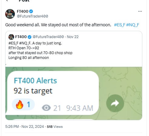 Sub stack subscription does not include real time telegram alerts it only includes this nightly news letter with levels and possible setups. For real time alerts please go to https://futuretrader400.substack.com/about