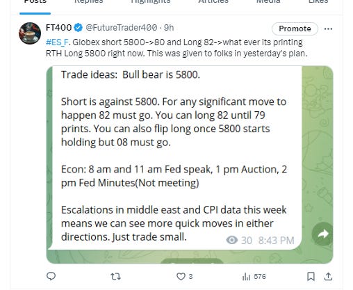 Sub stack subscription does not include real time telegram alerts it only includes this nightly news letter with levels and possible setups. For real time alerts please go to https://futuretrader400.substack.com/about