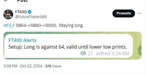 Sub stack subscription does not include real time telegram alerts it only includes this nightly news letter with levels and possible setups. For real time alerts please go to https://futuretrader400.substack.com/about