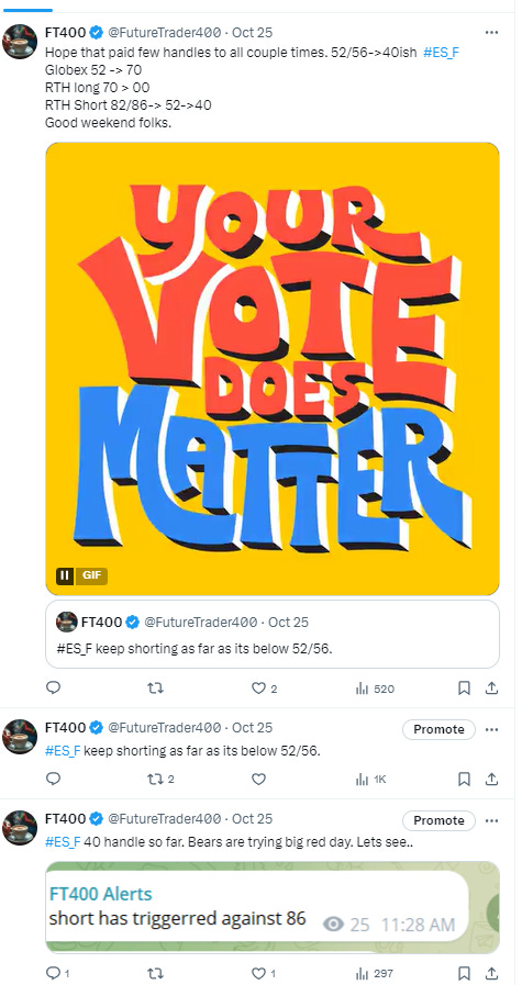 Sub stack subscription does not include real time telegram alerts it only includes this nightly news letter with levels and possible setups. For real time alerts please go to https://futuretrader400.substack.com/about