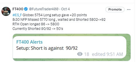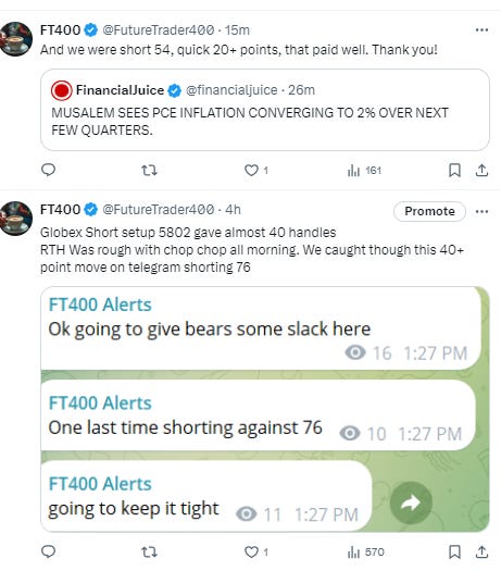 Sub stack subscription does not include real time telegram alerts it only includes this nightly news letter with levels and possible setups. For real time alerts please go to https://futuretrader400.substack.com/about