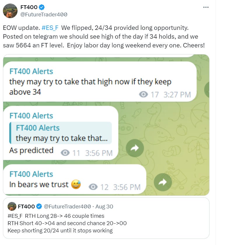 Sub stack subscription does not include real time telegram alerts it only includes this nightly news letter with levels and possible setups. For real time alerts please go to https://futuretrader400.substack.com/about