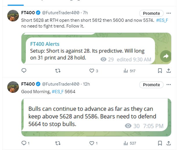 Sub stack subscription does not include real time telegram alerts it only includes this nightly news letter with levels and possible setups. For real time alerts please go to https://futuretrader400.substack.com/about