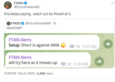 Sub stack subscription does not include real time telegram alerts it only includes this nightly news letter with levels and possible setups. For real time alerts please go to https://futuretrader400.substack.com/about