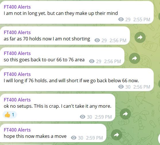 Sub stack subscription does not include real time telegram alerts it only includes this nightly news letter with levels and possible setups. For real time alerts please go to https://futuretrader400.substack.com/about
