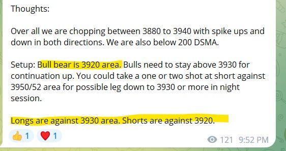 Hello traders, We had excellent short setup against 3938 going into night session that produced 30 points after 4 am. We were short against 3902 and 3916 after RTH open that gave few points. We had 3920 as bull bear going into today’s night session and RTH and it acted as such nicely. Here is what sent on telegram though I did not flip to long and had great FOMO after ramp up. We caught up some longs against 54 and 72 for 20 points. We also caught some shorts from 92’s that paid 10+ points. So were able to extract some part of the move.