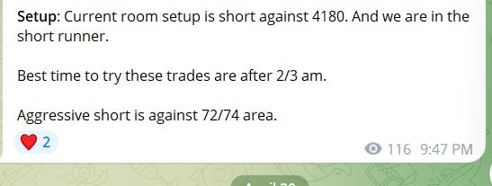 Hello traders, here is recap of what we did in globex and RTH today. We were short right before close yesterday against 4180 and then provided aggressive short against 72/74 for those who trade globex, which gave 30+ point down side.