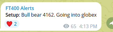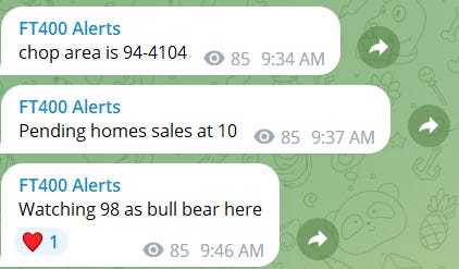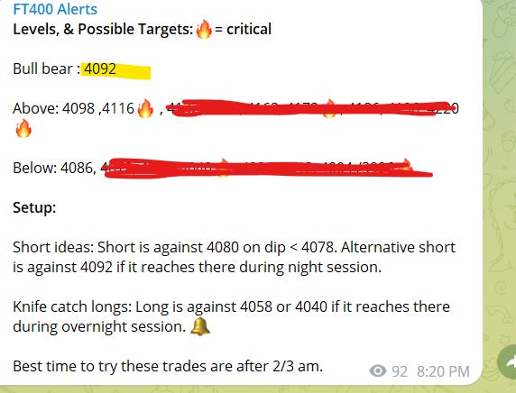 Sub stack subscription does not include real time telegram alerts it only includes this nightly news letter with levels and possible setups. For real time alerts please go to https://futuretrader400.substack.com/about