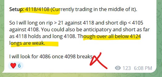 This is what I posted yesterday night. Price pretty much respected 4108 to 4118 area except a spike up to 4124 area which is what we were watching for bulls to capture. In RTH open we had 4108 as bull bear line and we stayed short below and longed above it. We also had stayed out of chop later in the morning. We longed 4118 and then shorted 4134 later. though 4198 broke, bulls recaptured that pretty fast.