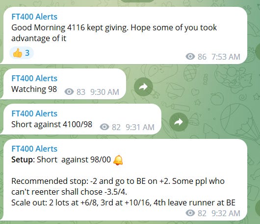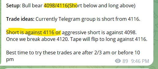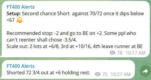 Sub stack subscription does not include real time telegram alerts it only includes this nightly news letter with levels and possible setups. For real time alerts please go to https://futuretrader400.substack.com/about