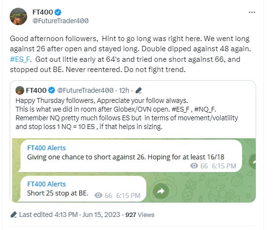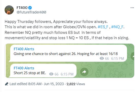 Sub stack subscription does not include real time telegram alerts it only includes this nightly news letter with levels and possible setups. For real time alerts please go to https://futuretrader400.substack.com/about