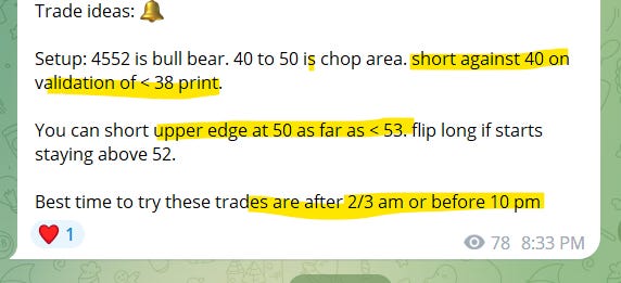 Sub stack subscription does not include real time telegram alerts it only includes this nightly news letter with levels and possible setups. For real time alerts please go to https://futuretrader400.substack.com/about