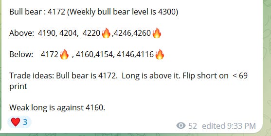 Sub stack subscription does not include real time telegram alerts it only includes this nightly news letter with levels and possible setups. For real time alerts please go to https://futuretrader400.substack.com/about