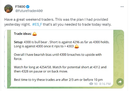 Sub stack subscription does not include real time telegram alerts it only includes this nightly news letter with levels and possible setups. For real time alerts please go to https://futuretrader400.substack.com/about