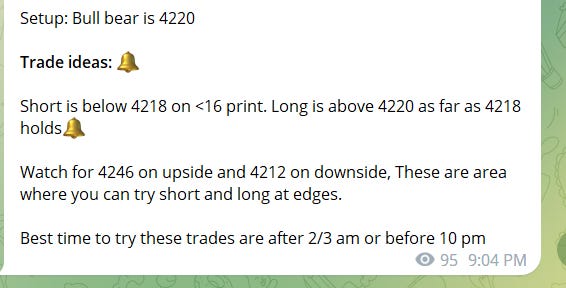 Sub stack subscription does not include real time telegram alerts it only includes this nightly news letter with levels and possible setups. For real time alerts please go to https://futuretrader400.substack.com/about