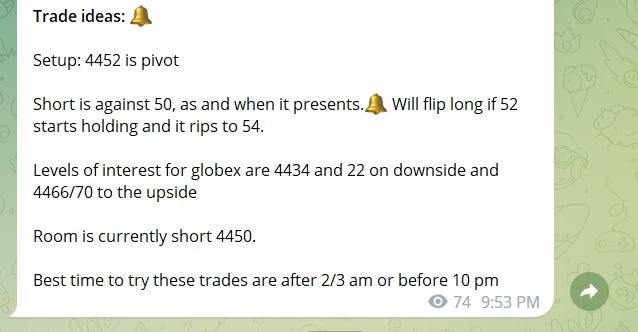 Sub stack subscription does not include real time telegram alerts it only includes this nightly news letter with levels and possible setups. For real time alerts please go to https://futuretrader400.substack.com/about