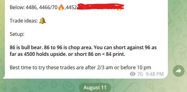 Sub stack subscription does not include real time telegram alerts it only includes this nightly news letter with levels and possible setups. For real time alerts please go to https://futuretrader400.substack.com/about