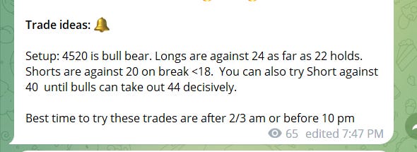 Sub stack subscription does not include real time telegram alerts it only includes this nightly news letter with levels and possible setups. For real time alerts please go to https://futuretrader400.substack.com/about