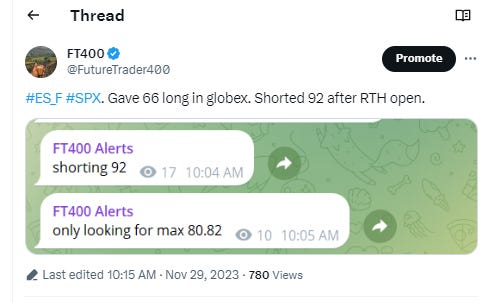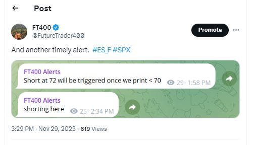 Sub stack subscription does not include real time telegram alerts it only includes this nightly news letter with levels and possible setups. For real time alerts please go to https://futuretrader400.substack.com/about