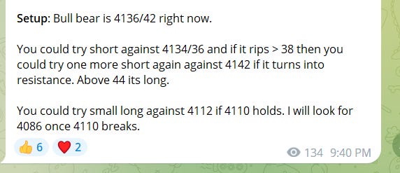 Sub stack subscription does not include real time telegram alerts it only includes this nightly news letter with levels and possible setups. For real time alerts please go to https://futuretrader400.substack.com/about