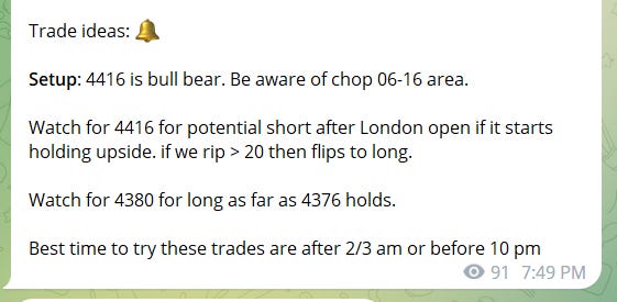 Sub stack subscription does not include real time telegram alerts it only includes this nightly news letter with levels and possible setups. For real time alerts please go to https://futuretrader400.substack.com/about