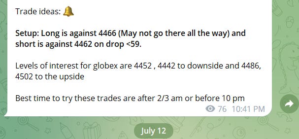 Sub stack subscription does not include real time telegram alerts it only includes this nightly news letter with levels and possible setups. For real time alerts please go to https://futuretrader400.substack.com/about