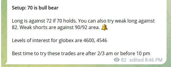 Sub stack subscription does not include real time telegram alerts it only includes this nightly news letter with levels and possible setups. For real time alerts please go to https://futuretrader400.substack.com/about