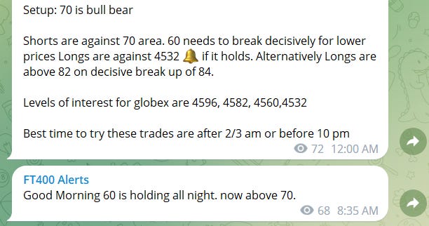 Sub stack subscription does not include real time telegram alerts it only includes this nightly news letter with levels and possible setups. For real time alerts please go to https://futuretrader400.substack.com/about
