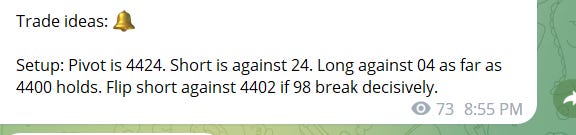 Sub stack subscription does not include real time telegram alerts it only includes this nightly news letter with levels and possible setups. For real time alerts please go to https://futuretrader400.substack.com/about