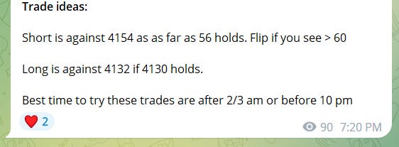 Hello traders, Here is what I posted on sub stack/telegram on yesterday night. Short against 54 gave 20 points by RTH open. After RTH open we stayed short against 4142 with target 4132 as a target which kept on holding but gave couple of good shorts to extract enough points for dull day with 12 point range. We stayed out of the market in the afternoon to avoid chops.