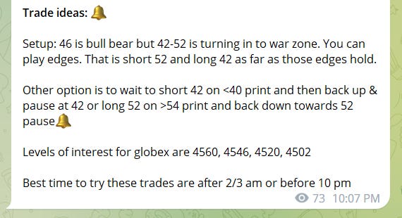 Sub stack subscription does not include real time telegram alerts it only includes this nightly news letter with levels and possible setups. For real time alerts please go to https://futuretrader400.substack.com/about